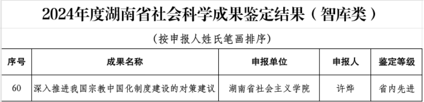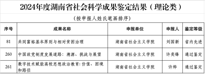 近日,湖南省社会科学成果评审委员会拼搏在线发布《2024年度湖南省社会科学成果鉴定名单公示》,我院申报的4项成果全部通过鉴定,其中2项成果鉴定等级为省内先进。