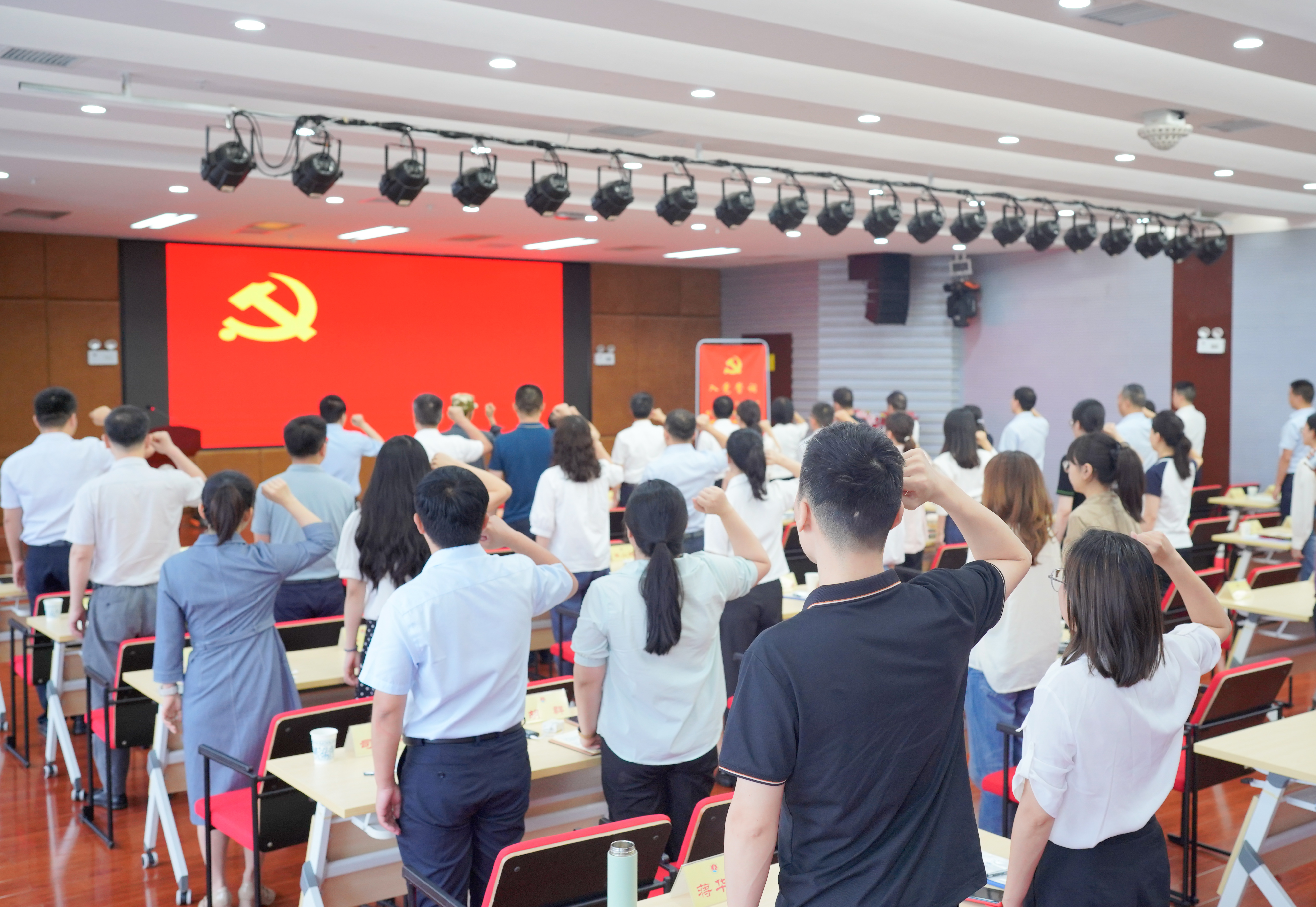 简朴庄重的仪式上,全体党员重温入党誓词,符俊根为陈若海、刘伏堂两位老同志颁发“光荣在党50年”纪念章。纪念章获得者代表和青年党员代表作了发言。