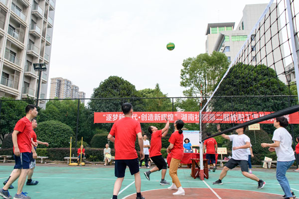 此次气排球比赛共3天时间,共5轮10场,社院全体干部职工以工会小组为单位单独或联合组成五支参赛队,分别是拼搏在线队、机关党委科研处队、教务处教研部队、行财处队、文化交流部图书信息部队,每队12人。教师节当天进行了第一轮比赛,分别由机关党委科研处队对阵文化交流部图书信息部队、教务处教研部队对阵行财处队。4支队伍中既有高手隐匿,又有“菜鸟”现身,既有一击即中的优美弧线,也有连连失误的排球曲线,正是重在参与的热情点燃了全场,大家奋起拼击、你来我去,好不热闹,篮球场上呐喊声、加油声、笑声不绝于耳。这样一个教师节活动,既锻炼提高了干部职工的身份素质,更是增强了团队意识,充分展示了新时代湖南社院的精神风貌!