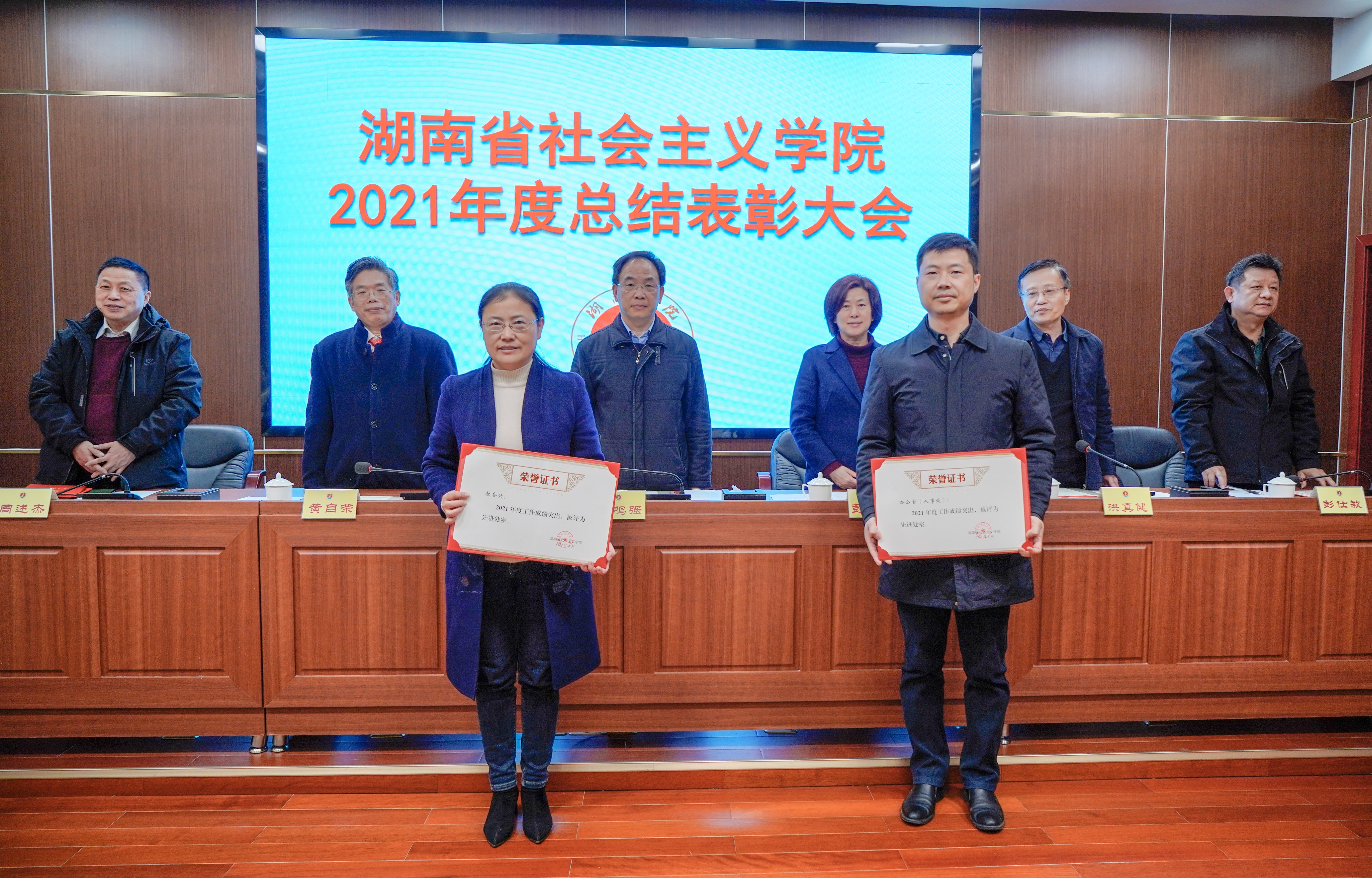 会议表彰了拼搏在线(人事处)、教务处等2个2021年度先进处室,刘蓉宝、饶湘燕、朱学农、於艺陵、陶剑锋、何桂启、雷明贵、许奕锋、刘恋、肖了英、李维、邹颖等12名优秀个人;表彰了文明创建工作中文明标兵处室、文明标兵职工和文明家庭。